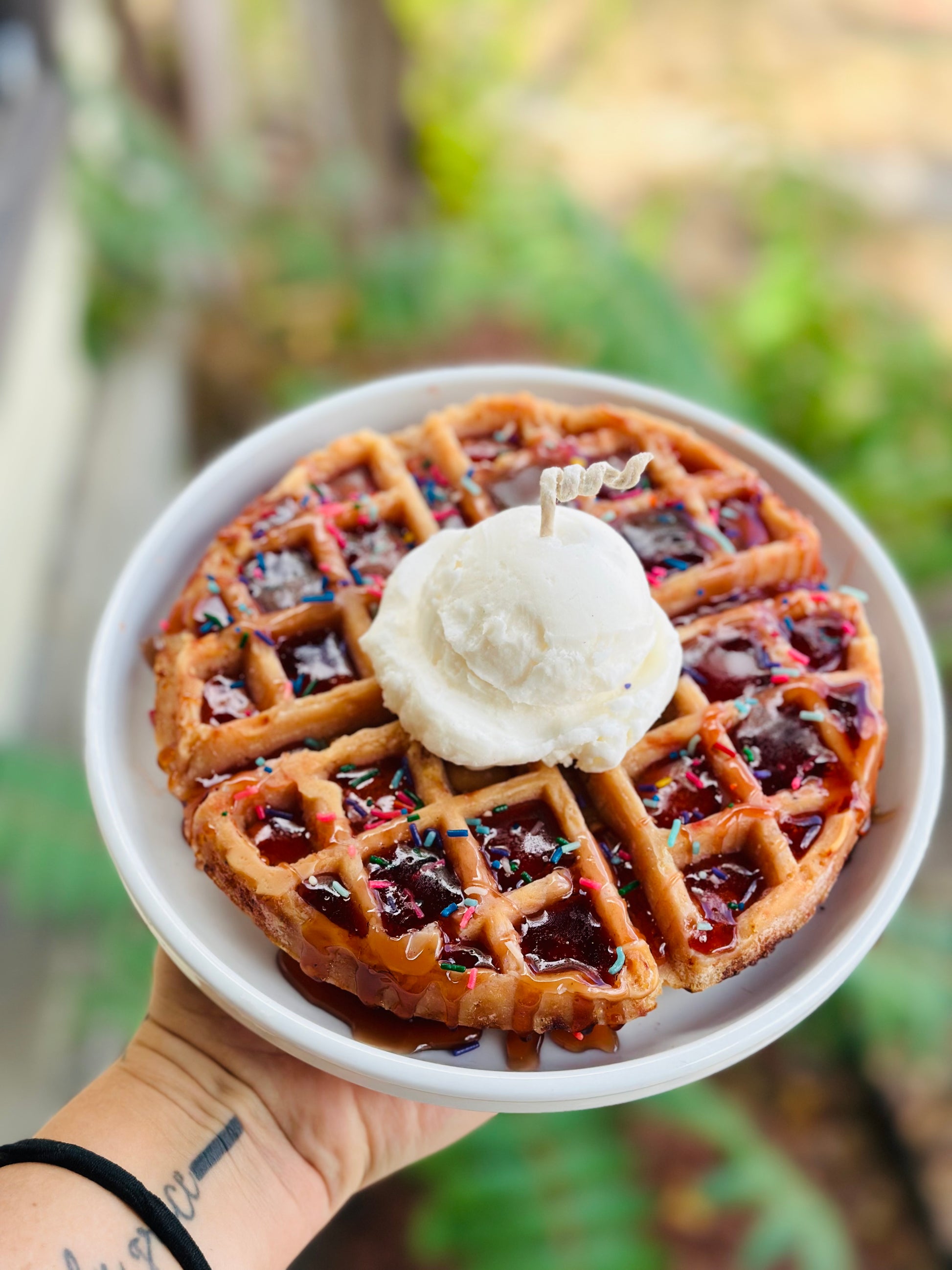 Deliciously scented hyper, realistic waffle candle with a scoop of ice cream for finishing touches. This candle smells how it looks and has realistic syrup like Wax poured over top.